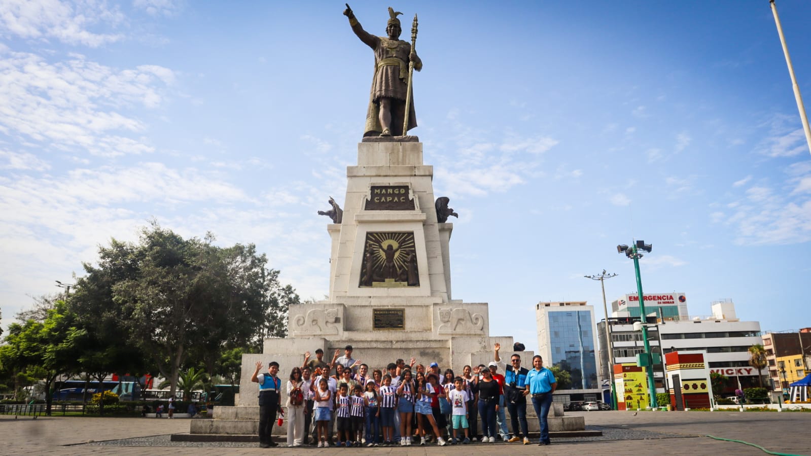 La ruta inició en la emblemática Plaza Manco Cápac, uno de los espacios públicos más representativos del distrito. En este lugar los visitantes conocieron la historia de la plaza y de la escultura del fundador mítico del Imperio Inca, que se levanta como símbolo de identidad y memoria histórica para los vecinos de La Victoria.